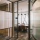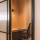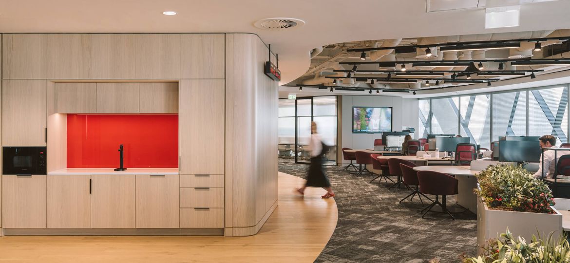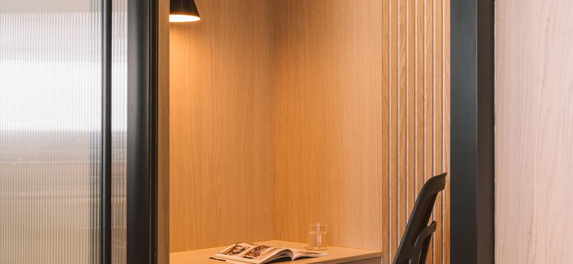 Elsewhere in the office, there is a curve sided private phone booth, a small staff T-point with microwave, cellular office and comms room. The space mostly retains the existing metal grid ceiling, but expands on an existing section of exposed services ceiling with track lighting that made a feature of the broker lounge. We also matched to the small section of existing timber flooring and existing carpet from a CAT A install so as not to waste brand new flooring.