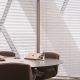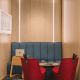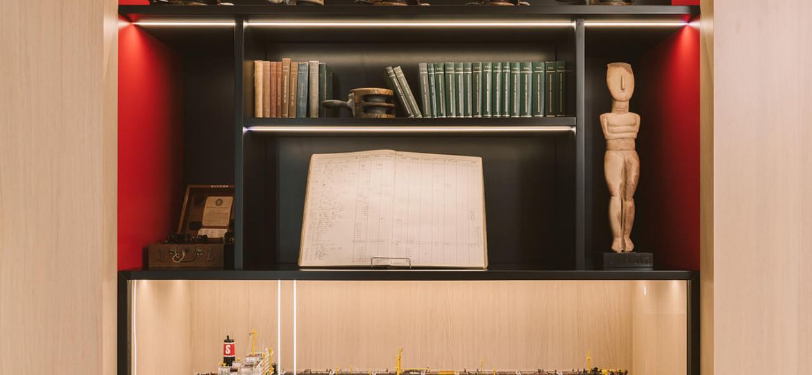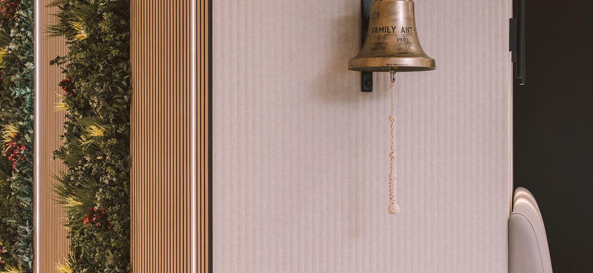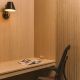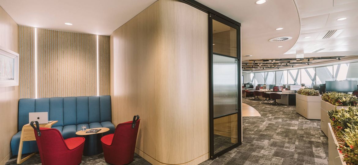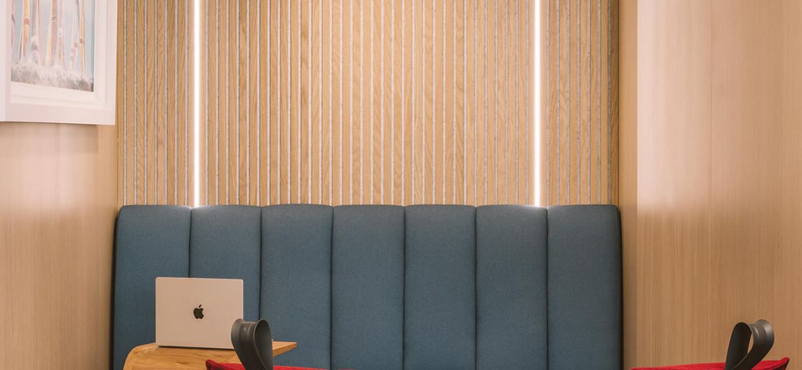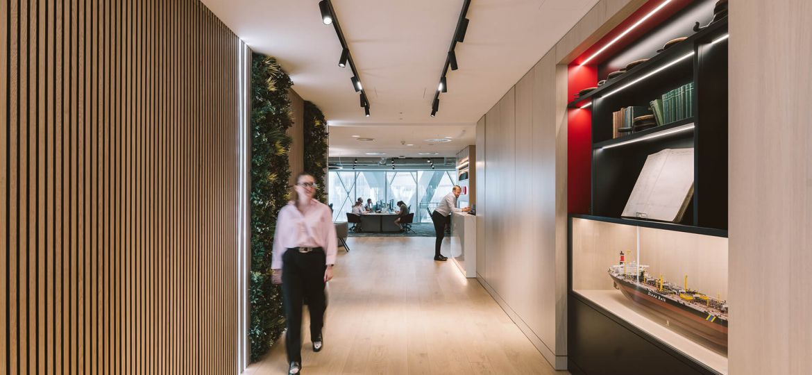 Throughout the space, a muted palette of soft white, warm grey and light oak timber provide a backdrop for hints of the Skuld brand red colour, tones of which are carried on through selected upholstery elements. The client also had a number of historic and important artefacts, including scale models of vessels and a wall mounted bell, that needed to be relocated into the new space with bespoke joinery pieces made to showcase these around the entrance and reception area. To further soften the space and add biophilic interest, planters top storage at the ends of desk and dividers to different spaces and the entrance lobby has framed green wall sections integrated between acoustic timber slat panels and lighting.