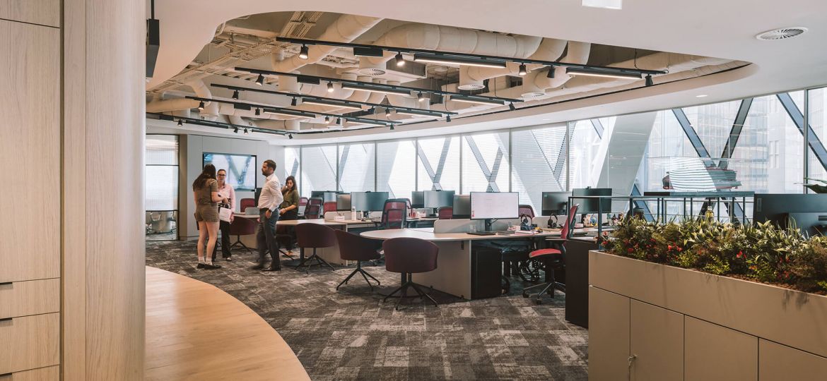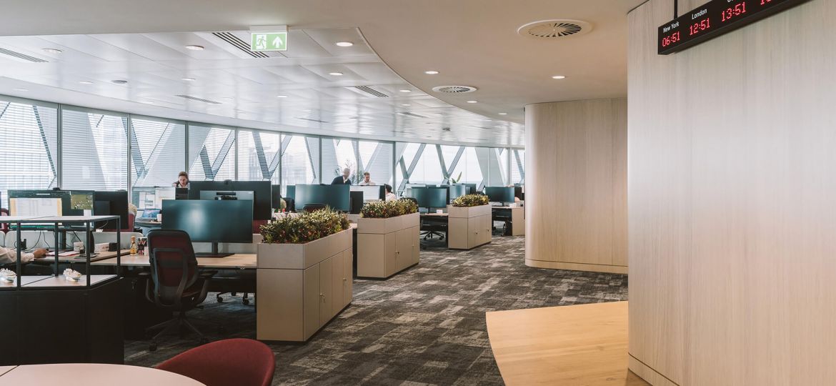 Designing in 30 St Mary Axe has it’s challenges, mainly due to the curved nature of the floorplate, but also fitting in with the existing M&E services and other basebuild restrictions. The key design focus of the space was to maximise the views across the space on arrival, past the broker desks and to the city beyond. To do this, we set back the reception desk and had an open breakout space for both visitors and staff to use, so it felt more like an inclusive business lounge. The two main meeting rooms were placed along the exterior to maximise natural light in the room, with bespoke joinery and acoustic baffle ceilings. The open plan broker desking and general support desking follows around the curve of the building, with large TV screens at each end and storagewall to the rear.